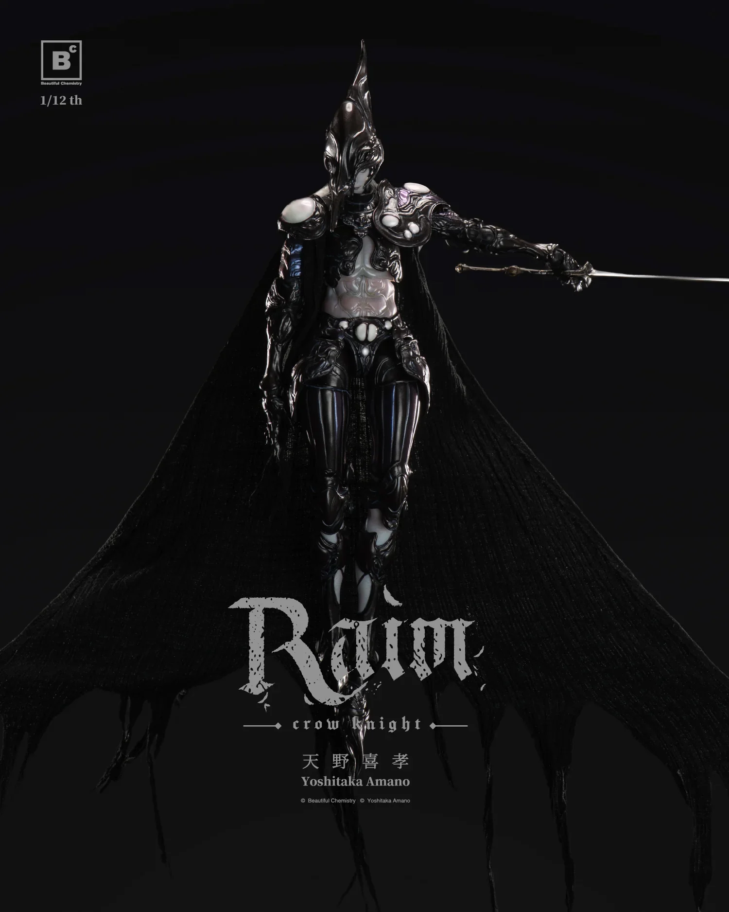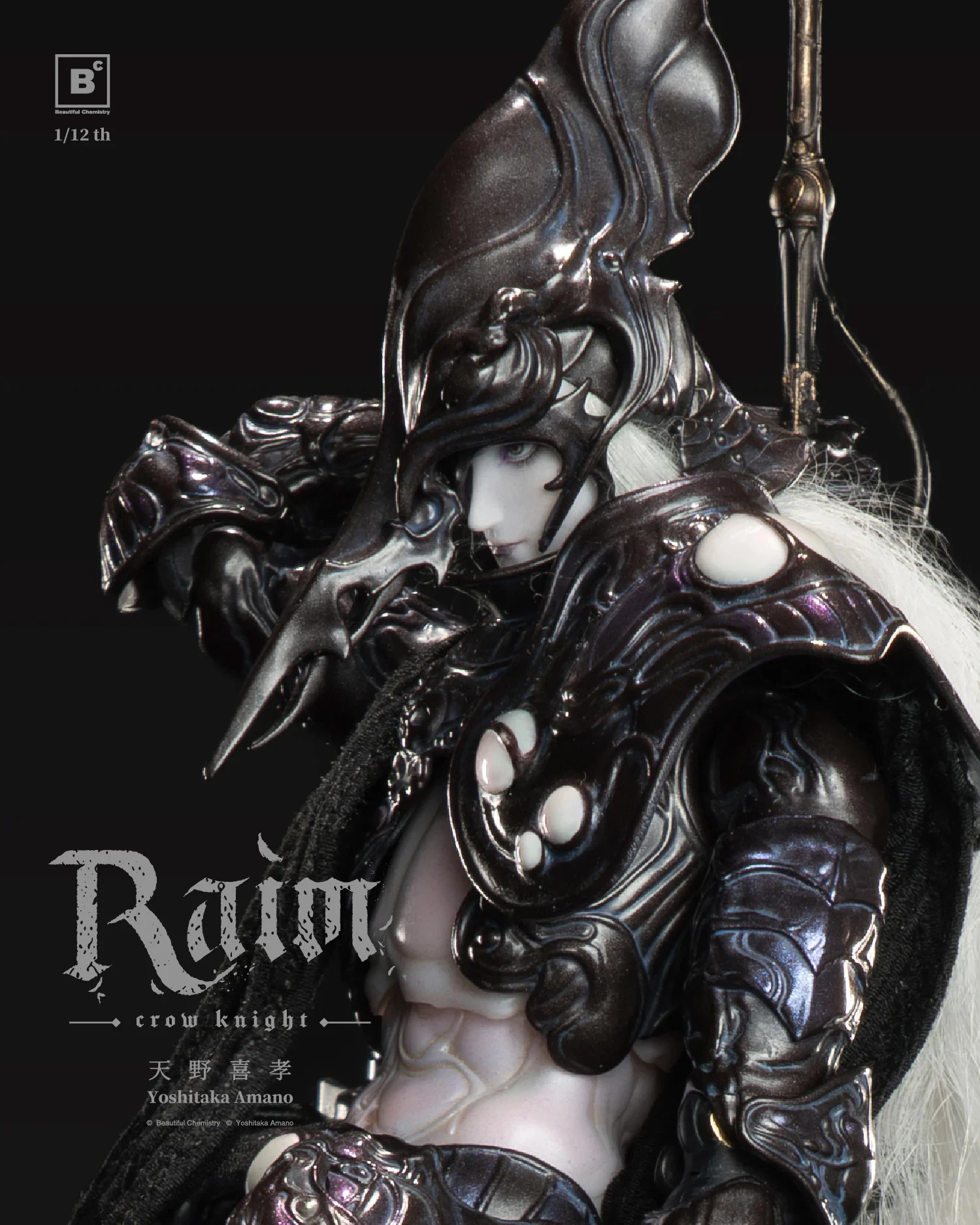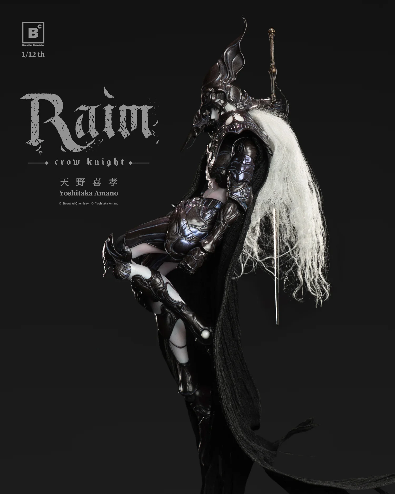 Der Beautiful Chemistry Crow Knight Raim zeichnet sich durch exquisite Details und Verarbeitungsqualität sowie äußerst detaillierte Bemalung aus. Beautiful Chemistrys erste Actionfigur im Maßstab 1:12 zeigt fließende, implantiertes Wollhaar und eine Ästhetik, die mit Yoshitaka Amano Vampire Hunter D vergleichbar ist – „Mystic Raven Knight – Raven Hunter Raim.“