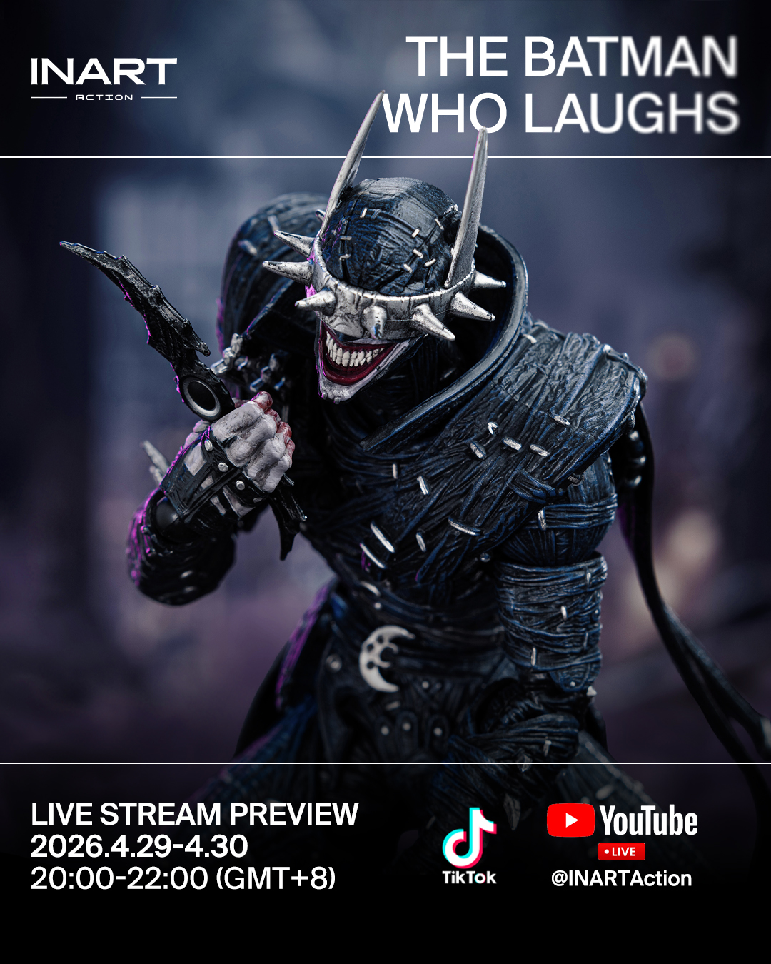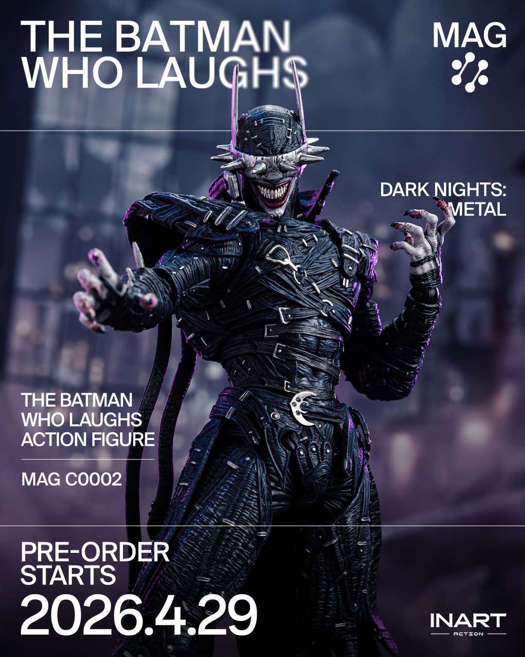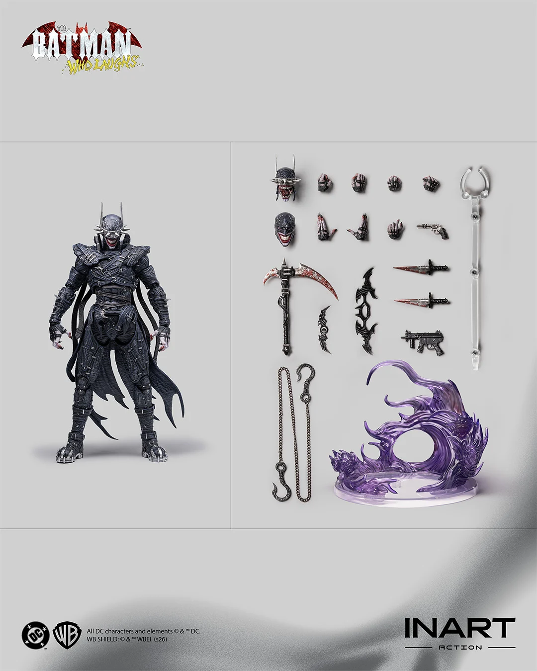 Offiziell lizenziert von Warner Bros und mit hochgradig beweglichen Taillen- und Halsgelenken ausgestattet, ermöglicht diese INART-Actionfigur dynamische Posen, die die verdrehten und ungelenkten Bewegungen von Batman Who Laughs mühelos einfangen. INART hat sorgfältig die ikonischsten Waffen der Figur aus seinen Comicauftritten ausgewählt, sodass Sammler eine Vielzahl klassischer Szenen nachstellen können. In Kombination mit einer charakterbezogenen Display-Basis verleiht diese Figur jedem Display eine dramatische Wirkung.