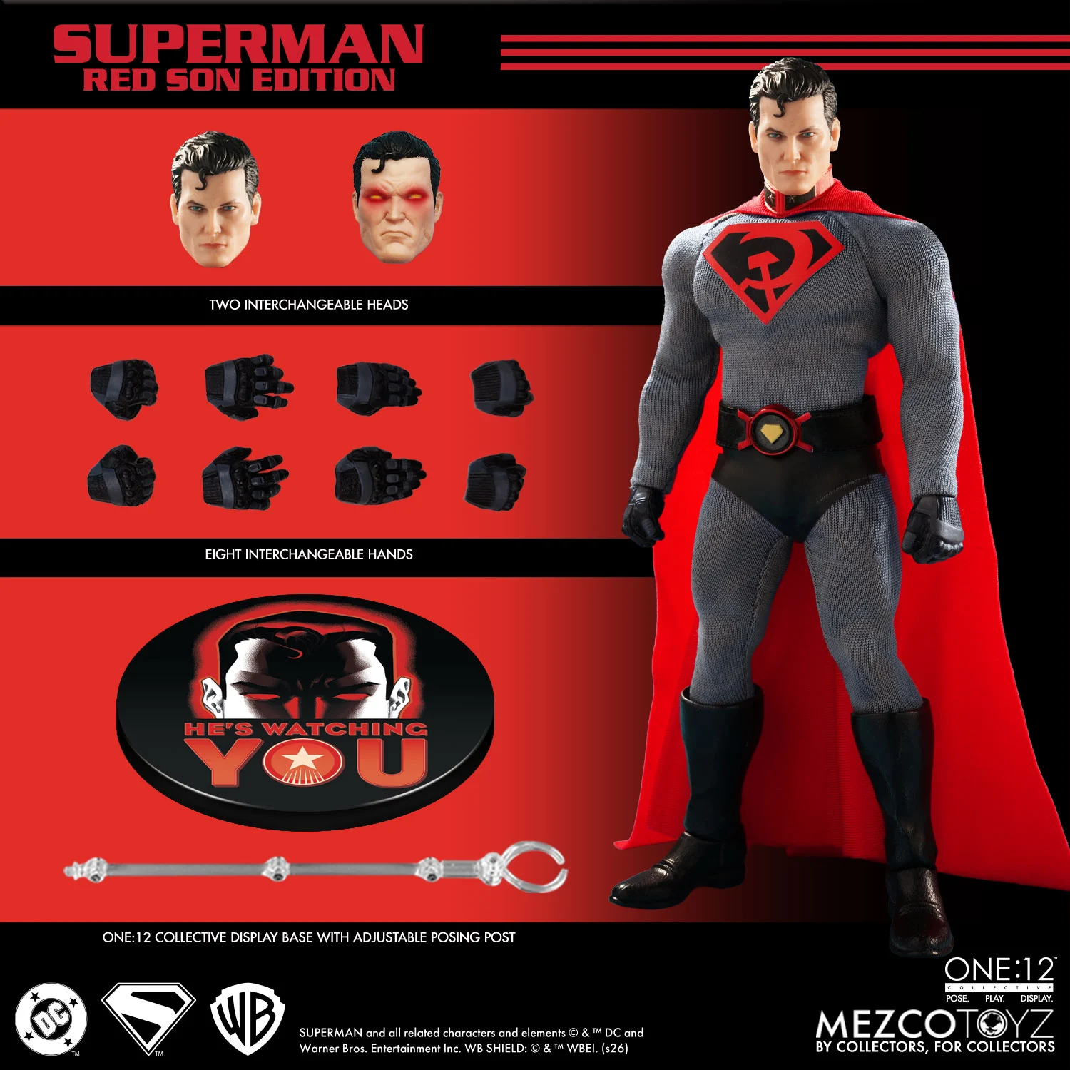 Das One:12 Collective Red Son Superman präsentiert eine eindrucksvolle Neuinterpretation des Mannes aus Stahl, gekleidet in einen strukturierten Anzug mit dem unverkennbaren Hammer- und Sichelwappen. Seine beeindruckende Präsenz wird von einem maßgeschneiderten Stoffumhang ergänzt, der mit einem integrierten Posendraht ausgestattet ist und dramatische, fliegende Darbietungen ermöglicht, die einer Welt unter seiner Aufsicht würdig sind.