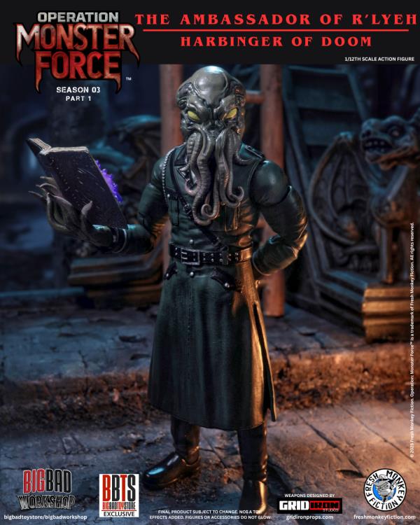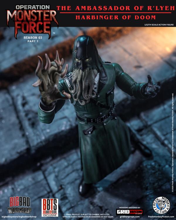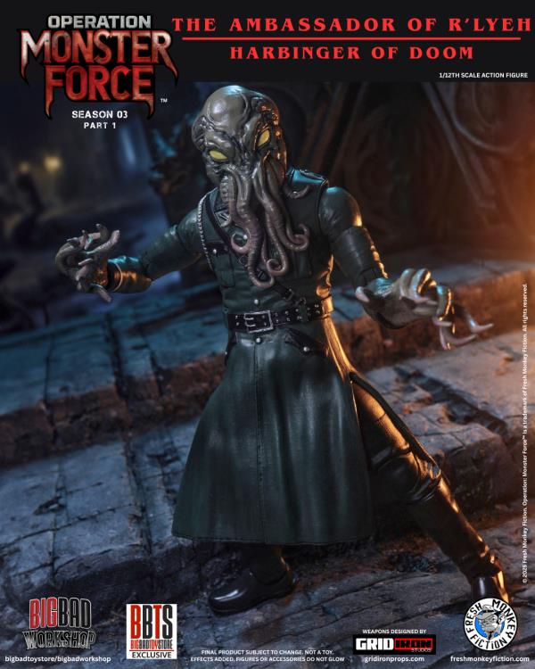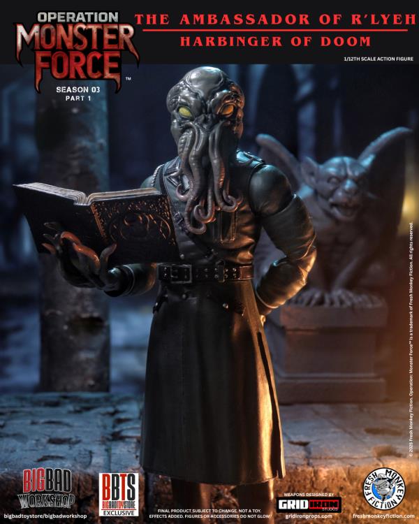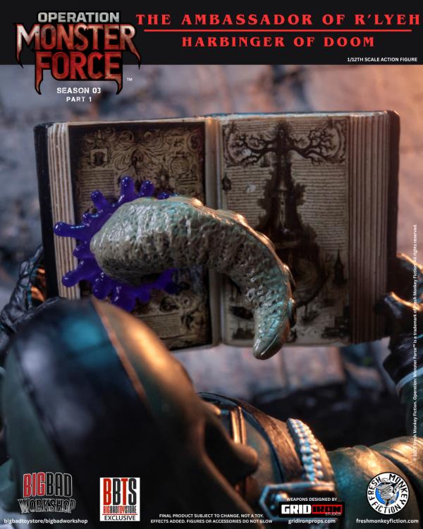 Jede Operation: Monster Force Actionfigur im Maßstab 1:12 verfügt über mehr als 20 Gelenkpunkte und enthält Zubehör wie: alternative Porträts, austauschbare Hände sowie einen Operation: Monster Force Grabsteinsockel zum einfachen Posieren und Ausstellen.