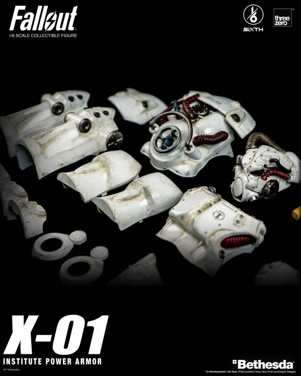 Die 1/6 X-01 Institute Power Armor Sammlerfigur ist ca. 14,5″ (36,8 cm) groß und verfügt über mehr als 35 Gelenkpunkte. Diese Powerrüstung besteht aus einem neuen, hochdetaillierten männlichen Kopf, einem austauschbaren X-01-Helm mit leuchtender LED-Funktion und einer Assaultron-Klinge. Wie alle vorherigen threezero FALLOUT-Figuren sind alle X-01-Außenrüstungsteile abnehmbar und austauschbar mit allen vorherigen threezero Fallout Power Armor Sammelfiguren. Unter der abnehmbaren Außenpanzerung befindet sich ein Endoskelett mit erstaunlicher Liebe zum Detail.
