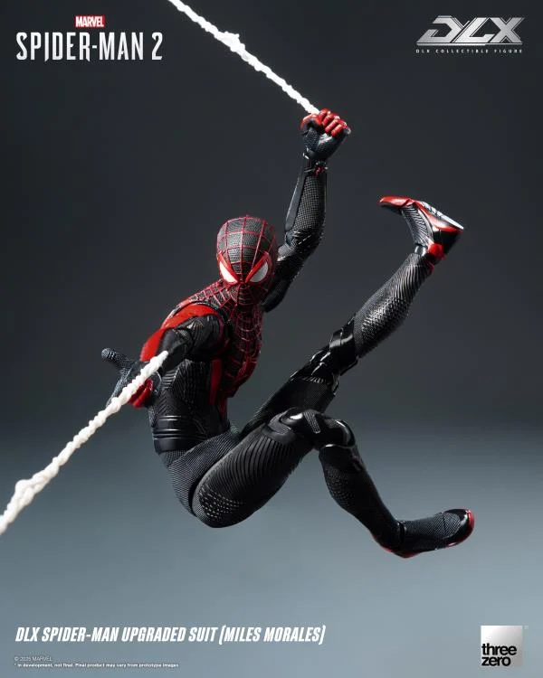 Der DLX Spider-Man Upgraded Suit (Miles Morales) ist etwa 15,7 cm (~6″) hoch und verfügt über das renommierte DLX-Druckgusssystem von threezero mit etwa 39 Gelenkpunkten, was eine ausgezeichnete Bewegungsfähigkeit und Haltbarkeit bietet. Die Figur zeichnet sich durch gut definierte, modellierte Muskeln und einen eng anliegenden Anzug aus, der verschiedene Stofftexturen zeigt und die reichen Kostümdesigns aus dem Videospiel widerspiegelt. Der schwarze Anzug ist mit roten Linien und einem modellierten Netzmuster verziert, und das große rote Spinnenemblem auf Brust und Rücken spiegelt genau das Aussehen in Marvel’s Spider-Man 2 wider.
